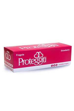 Box contenente 144 profilattici aromatizzati alla fragola I preservativi PROTEGGITI sono prodotti in lattice di gomma naturale, resistenti e di dimensioni standard: lunghezza nominale 185mm, larghezza 52mm +/- 2mm, spessore +/- 00,1mm. Sono inoltre ben lubrificati, testati elettronicamente con uno standard qualitativo molto alto e sigillati singolarmente in cialde quadrate monouso. I preservativi PROTEGGITI alla fragola sono adatti come contraccettivi e proteggono dalle malattie sessualmente trasmissibili. Certificazione EN ISO 4074:2002