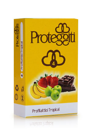 Box contentente 4 profilattici I preservativi PROTEGGITI sono prodotti in lattice di gomma naturale, resistenti e di dimensioni standard: lunghezza nominale 185mm, larghezza 52mm +/- 2mm, spessore +/- 00,1mm. Sono inoltre ben lubrificati, testati elettronicamente con uno standard qualitativo molto alto e sigillati singolarmente in cialde quadrate monouso. I preservativi all`aroma Tropical PROTEGGITI sono adatti come contraccettivi e proteggono dalle malattie sessualmente trasmissibili. Certificazione EN ISO 4074:2002