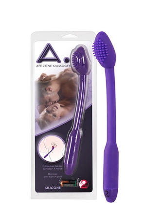Purple vibrator with a thin neck and thickened head with stimulating knobs. Specifically designed to stimulate the A-spot (between G-spot and the cervix). Seven vibration levels adjusted at the push of a button. Length approx. 23 cm, Ø 1.4-2.2 cm. Material: silicone, ABS, phthalate-free according to EU Regulation REACH. Batteries included. Composizione: Silikon, ABS