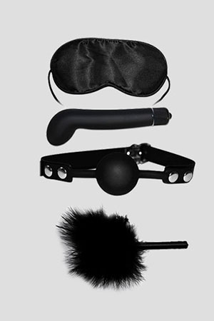 Kit Bondage Deluxe completo di: mascherina oscurante, piuma, morso con cinturino borchiato e pallina, e vibratore di design nero. Un kit total black per una notte dalle sensazioni oscure, intriganti e vibranti. Potrete bendare, serrare la bocca e far godere il vostro partner stimolandolo inizialmente con la piuma nera per passare al piacere intenso della penetrazione vibrante.