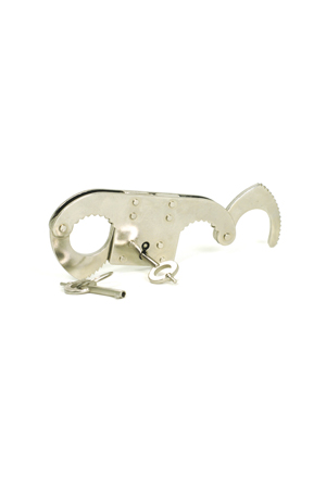 Manette per pollici in robusto metallo. Delle vere e proprie manette per pollici a cremagliera.