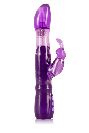 Purple, rotating vibrator with a rabbit-shaped clit tickler, 3 thrust function levels and 7 vibration modes for clitoris stimulation at the push of a button. Complete length 24 cm, length without controls 16 cm. Ø 2.8-3.7 cm. Material: TPE, ABS, phthalate-free according to EU Regulation REACH. (Please order batteries separately: 4 x Micro/AAA). Composizione: TPE, ABS