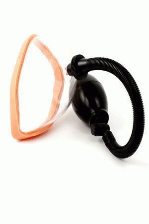 La pompetta aspira l`aria dalla coppetta in plastica trasparente creando il sottovuoto e facendo ingrossare le labbra della vagina.