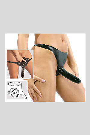 Slip per donna con triplice fallo, realizzato in lattice nero. Un fallo esterno per soddisfare il partner e due interni, anale e vaginale, per una completa soddisfazione di chi lo indossa. Dimensioni fallo esterno: 18 cm lunghezza, 4 cm diametro. Dimensioni fallo vaginale: 13 cm lunghezza, 3 cm diametro. Dimensioni fallo anale: 11 cm lunghezza, 2,5 cm diametro.